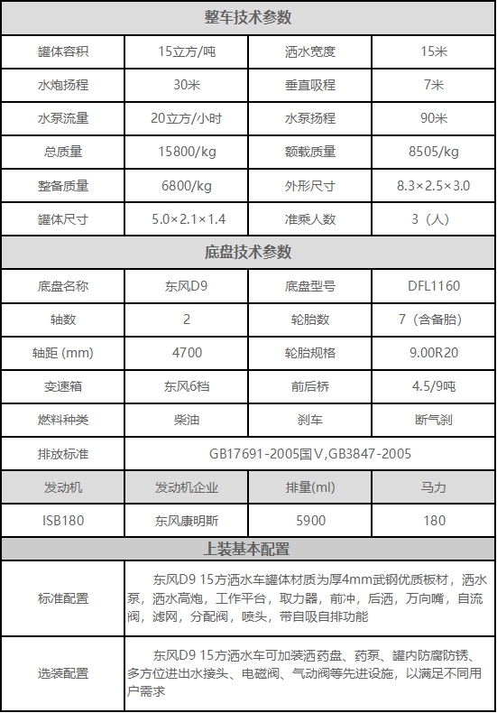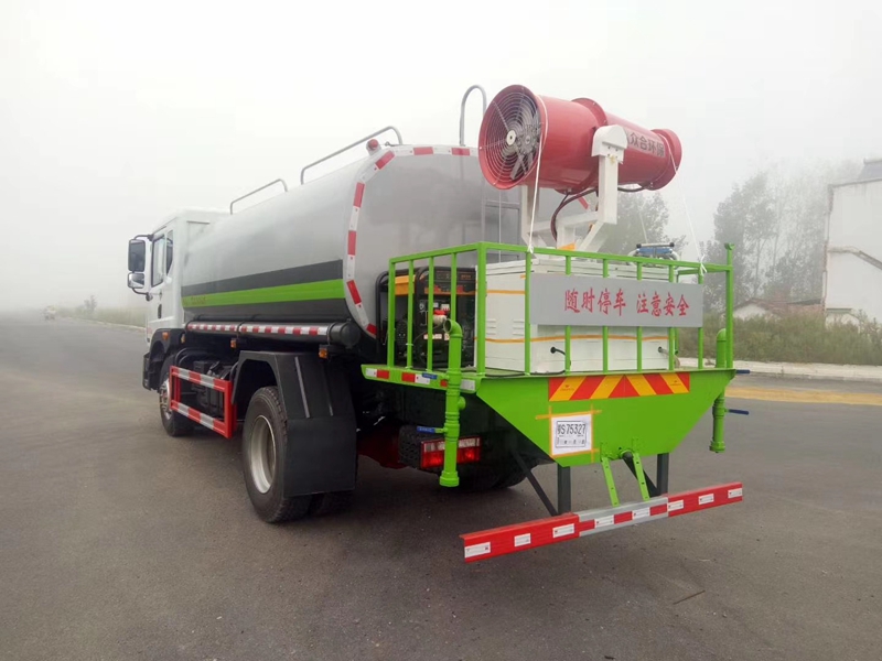 4500軸距,玉柴200馬力/康機(jī)210馬力發(fā)動(dòng)機(jī),法士特8檔變速箱,10.00鋼絲胎,前橋4.5T后橋10T 原廠空調(diào),容積15立方米,ABS ,采用大流量水泵,大通徑球閥、基本灑水功能前沖、后灑、側(cè)噴、工作平臺(tái)帶軸承高炮(可調(diào)節(jié)成霧狀、直柱狀)、可泵進(jìn)泵出、罐體兩側(cè)圓形炮筒、帶兩根抽水軟管,尾部加裝30米霧炮機(jī)組。